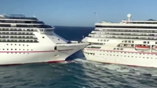 A video taken from an upper deck of Carnival Glory, which can carry nearly 3,000 passengers, shows pieces of the ship tumble onto the deck of the oncoming vessel, with some splashing into the churning water.