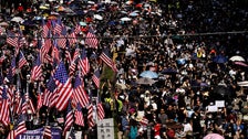 A mixed crowd of hardcore protesters in black and wearing masks, along with families with children, spilled into the roads of the Causeway Bay shopping belt and marched for over 2 kilometers (1.2 miles) to the Central business district. Some waved U.S. and British flags, while others carried posters reiterating their calls for democratic reforms.