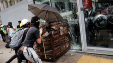 A small group, mostly students wearing hard hats and masks, used a metal trolley, poles and pieces of scaffolding to hack through reinforced glass and charge at the government compound near the heart of the financial center.