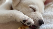 “Chesterfield, have you fallen asleep with your bone in your mouth? I think you have,” Aniston can be heard whispering in a video of the sleepy little lord:
